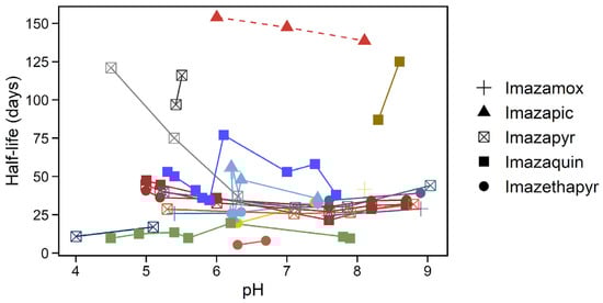 Relationship between soil pH and imidazolinone half-life (days). The dashed line corresponds to the work of Su et al. [25].