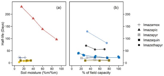 In general, imidazolinone degradation is slower under conditions of lower soil moisture. As highlighted by Wu, He, Dong, Zhou, and Zhang [27], the average half-life was 15 days longer in soil with moisture levels of 30% field capacity than in soils with 50% and 70% field capacity. These results are consistent with findings by Ismail and Ahmad [51], who also noted that moisture-related reductions in the half-life were greater in soils with clayey textures.