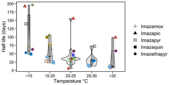 Some authors note that microbial degradation is affected primarily by soil moisture and secondly by temperature [25,28]. Temperature is directly related to the growth rate, microorganism metabolism, and enzymatic kinetics [59]. The dataset analyzed in this study supports the relationship between imidazolinone degradation and temperature, as shown in Figure 9. Temperature increases result in a reduction in the half-life. The optimum temperature appears to be between 25 °C and 35 °C [25,60]. Meanwhile, temperatures below 20 °C increase the persistence of herbicides in the soil [28,61].