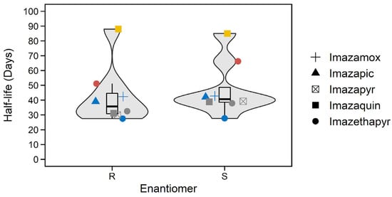 Due to its higher affinity with the ALS enzyme, the R- enantiomer of imidazolinones causes greater ALS inhibition than the S- enantiomer of the racemic mixture [63,64]. The same behavior is reflected in imidazolinones’ biodegradation since it occurs through enzymatic catalysis in the soil. In addition to its higher agronomic effectiveness, some authors point out that the R-isomer has a slightly shorter half-life in the soil, as shown in Figure 10. However, its half-life remains sensitive to edaphoclimatic variables and is dependent on the particular microorganism community of each soil [27]. However, the potential use of enantiomers is not only limited by the lack of information about their herbicidal activity and environmental behavior but rather because no commercially available imidazolinone herbicides are sold with enrichment of the R-enantiomer. Only the racemic mixture is sold, mainly due to the difficulty and cost of producing and isolating isomers on a large scale [65].