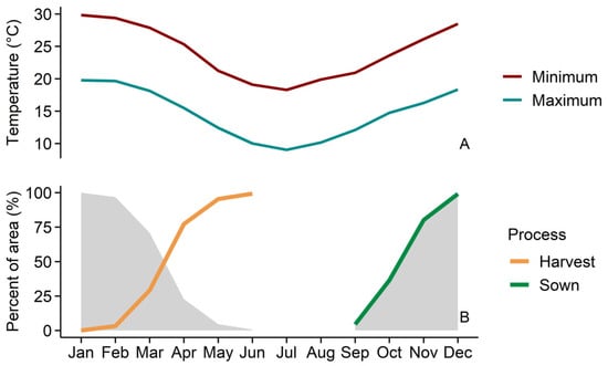 (A) Monthly average minimum and maximum temperatures from 2000 to 2019 (Source: Dados da Rede do INMET [73]), (B) Average harvest and planting activity in the Rio Grande do Sul state, Brazil between 2010 and 2019 (Source: IRGA [74]). The shaded area represents the percentage of Rio Grande do Sul State (largest rice producer in Brazil) acreage with rice crop progression from initial establishment (sowing starting in Sep.) to final harvesting (end of May).