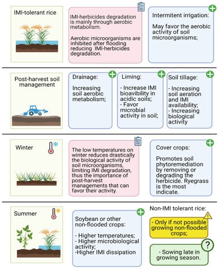 In order to better manage imidazolinone residues in the soil, the results from this review indicated several management practices that can be adopted to reduce the carryover effect on subsequent crops. During the rice season, an alternative that may be used is the adoption of intermittent irrigation. This irrigation practice, besides maximizing the use of water, allows for soil aeration and, therefore, improves the rate of degradation of imidazolinones by aerobic microorganisms. However, there are few studies demonstrating that intermittent irrigation can be an efficient alternative to improve imidazolinone dissipation during the rice season. Therefore, it is suggested that this subject needs further investigation to better validate the technique for this purpose. After rice harvesting, soil drainage and the use of cover crops (such as ryegrass or other crops) allow for remediation and greater degradation (by aerobic microorganisms) of imidazolinone residues. As already mentioned, liming the field in the off-rice season would greatly benefit dissipation and improve soil quality to introduce other rotational crops, especially in the summer, such as soybean, for example. Therefore, rice farmers should consider these strategies isolated or jointly to minimize carryover problems. It is important to note that it is possible that the adoption of multiple strategies would result in a high dissipation effect. Some strategies are required to be used in combination such as drainage, liming, and rotation with soybean. However, results of the combined effect of these strategies are lacking in the current literature. Based on the discussion outlined in this review, the primary management strategies used to minimize carryover effects in lowland areas are summarized in Figure 12.