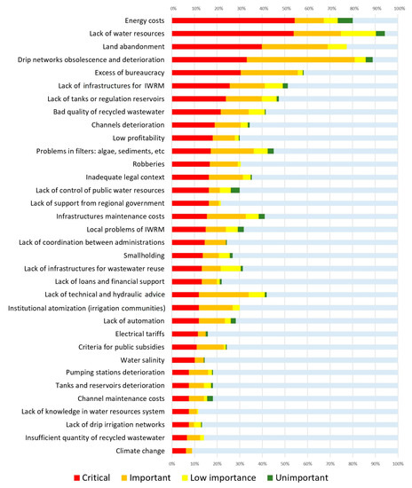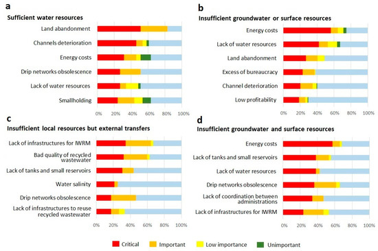 This order of priorities significantly changes when the WUAs responses are classified according to different criteria. Considering water resource availability (Figure 3), in those districts with sufficient water resources, land abandonment was clearly indicated as the main problem (83%), while drip irrigation and gravity irrigation infrastructure obsolescence (51 and 53%, respectively) were also highlighted. Lack of water was valued by 33% WUAs as important or very important. In areas with partial or total insufficiency of water resources (Figure 3b,d), lack of water resources ranked in second (53%) and eighth (42%) place, respectively, with energy consumption costs regarded as the main problem (64% in both areas). Obsolescence was the second biggest problem, sharing this position with land abandonment in areas with moderate abundance. In areas with insufficient local resources and receiving external transfers (Figure 3c), lack of water was a less significant problem, and only 22% of WUAs identified it as critical. In these areas, nine problems ranked higher, mainly lack of infrastructure for integrated water resources management (IWRM) (63%), lack of quality of recycled wastewater (60%), irrigation network obsolescence (47%) and lack of small reservoirs for irrigation regulation (44%).