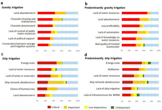 Problem assessment according to irrigation technique: evaluated in terms of percentage of total votes. (a) Gravity irrigation; (b) Predominantly gravity irrigation; (c) Drip irrigation; (d) Predominantly drip irrigation.