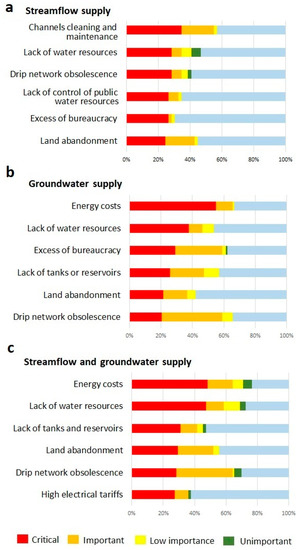 Following the criteria based on the origin of water resources, very similar results were obtained (Figure 5). The areas using surface water (where gravity irrigation also predominates) presented a greater concern for channel maintenance (54%) and land abandonment (43%), and also some worries regarding water shortages and network obsolescence (both 35%). On the other hand, in groundwater and mixed areas, concerns concentrated on energy costs (66 and 63%, respectively), network obsolescence (58 and 63%), lack of tanks and local regulation reservoirs (44 and 41%) and water shortages (43 and 58%). Mixed areas presented a significantly higher concern for land abandonment (53%) than in groundwater areas (33%).