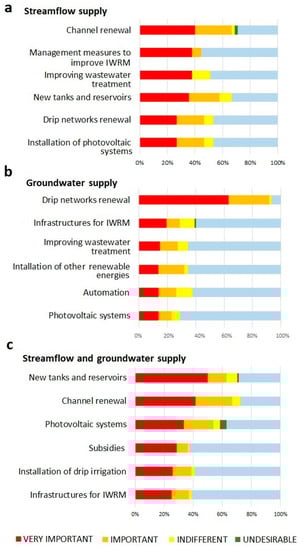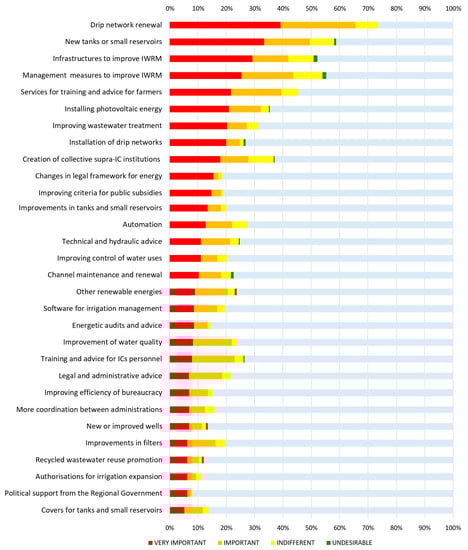 After three decades of strong public investment in the modernization of irrigation systems, the regional irrigation sector faces new challenges, emanating both from a new economic and environmental context—associated with climate change and the globalization of agricultural markets—as well as from the irrigation modernization process itself. In this sense, it is particularly interesting to observe how, during the workshops, the measure in highest demand was investment in new infrastructure works to renovate the irrigation facilities, which have already become obsolete or will deteriorate in very few years. This measure was mainly voted for in groundwater areas (92%), probably because these zones were the first to install these systems [39].