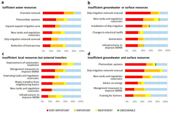 Measure evaluation according to water resource availability: evaluated in terms of percentage of total votes. (a) Sufficient water resources; (b) Insufficient groundwater or surface resources; (c) Insufficient local resources but external transfers; (d) Insufficient groundwater and surface resources.