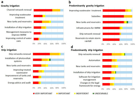Measure evaluation according to irrigation technique: evaluated in terms of percentage of total votes. (a) Gravity irrigation; (b) Predominantly gravity irrigation; (c) Drip irrigation; (d) Predominantly drip irrigation.