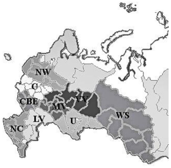 Russian agroecological regions. NW, Northwestern; NC, North Caucasian; CBE, Central Black Earth; C, Central; LV, Low Volga; U, Ural; WS, Western Siberian; MV, Middle Volga; and VV, Volgo-Vyatka regions.