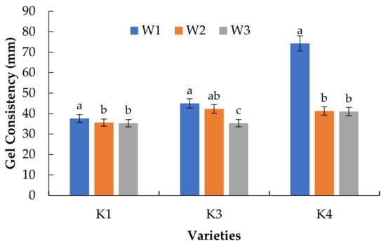 Rice gel consistency under water deficit. W1, continuous flooding; W2, 2-day irrigation interval; W3, 3-day irrigation interval. Values with similar letters are not significantly different (p < 0.05).