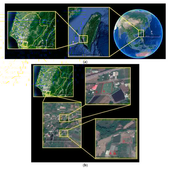 Agricultural farmlands in southern Tainan City with an area range of 0.01 to 0.3 ha (Figure 1b) served as the study site (Table 2).