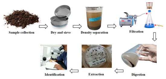Soil samples were thus treated with 30% H2O2 overnight to remove natural organic material, followed by filtration and a second drying step. Filter papers were then saved in Petri dishes for further inspection and identification. A schematic diagram of analytical procedures for MPs extraction in soil samples is depicted in Figure 2.