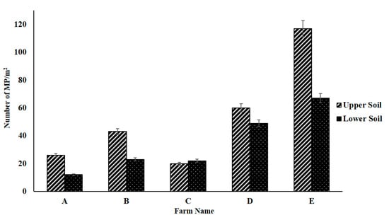 Besides, t-test analysis results showed no statistically significant difference between mean MPs particles in two different depths (p-value = 0.383). As shown in Figure 3, there was as high as 67 items/m2 in deep soil samples, which shows MPs have been detected in various soil profiles, likely as a result of movement through cracks, fissures, and biopores, including earthworm burrows and root channels [43].