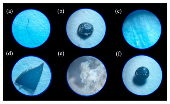 Different shape of MPs detected in this study including (a) fibers, (b) pellets, (c) films, (d) fragments, (e) foams, and (f) microbeads.