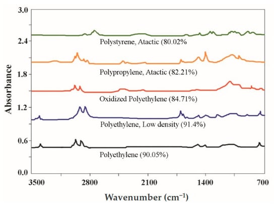 The ATR-FTIR comparative spectra of MPs extracted from the various soil samples were plotted as shown in Figure 10. Five plastic debris categories, including PE, LDPE, oxidized polyethylene (oxidized PE) polypropylene (PP), and PS were identified, with a mean match degree of 85.67% with the standard database. The match degrees of the three PE categories were relatively higher than PS, which is consistent with Fok et al. [60] reporting that the match degrees of PS forms are lower than PP and PE. Weathering, aging, and adherence can all have an impact on the matching degree of MPs with the standard database. Statistical results indicate that LDPE followed by PS are the major polymer type of MPs in the studied farms, which is in consistent with the main type of MP found in the study, fragment and fibers.
