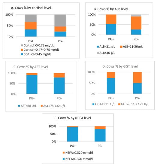 Frequency of PG+ and PG− cows by level of metabolic blood profile indicators: (A)—cows ℅ by cortisol level; (B)—cows ℅ by albumin level; (C)—cows ℅ by aspartate aminotransferase level; (D)—cows ℅ by gamma glutamyltransferase level; (E)—cows ℅ by non-esterified fatty acids level; ALB = albumin; AST = aspartate aminotransferase; GGT = gamma glutamyltransferase; NEFA = non-esterified fatty acids; PG+ = pregnant cows; PG− = non-pregnant cows.