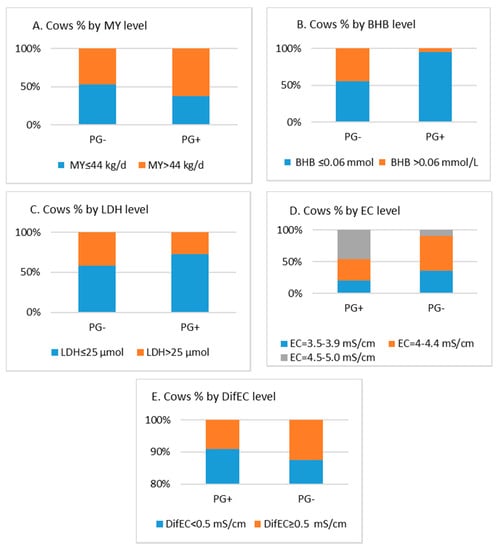 Frequency of PG+ and PG− cows by level of AMS variables. (A)—cows ℅ by milk yield level; (B)—cows ℅ by β-hydroxybutyric acid level; (C)—cows ℅ by lactate dehydrogenase level; (D)—cows ℅ by electric milk conductivity level; (E)—cows ℅ by difference between electric milk conductivity values in udder quarters level; MY = milk yield; BHB = β-hydroxybutyric acid; LDH = lactate dehydrogenase; EC = electric milk conductivity; DifEC = difference between EC values in udder quarters. PG+ = pregnant cows; PG− = non-pregnant cows.