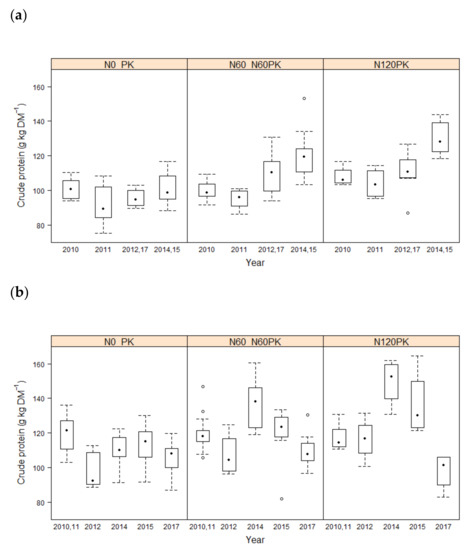 The minimal adequate model for the effect of fertilization treatment and time on the concentration of crude protein (g kg DM−1) for the first (a) and second (b) cuts with different fertilization treatments between 2010 and 2017 (except 2013 and 2016). Level needed for female sheep (70–100 kg): 72–73 g kg DM−1, for ewes (70–100 kg) rearing a single lamb: 122–143 g kg DM−1, for rams 100–120 kg: 75 g kg DM−1, for rams in the breeding season: 140 g kg DM−1 [76].