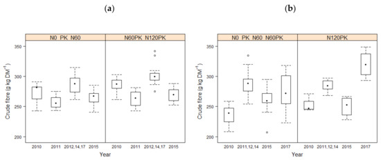 The minimal adequate model for the effect of fertilization treatment and time on the concentration of crude fiber (g kg DM−1) for the first (a) and second (b) cuts with different fertilization treatments between 2010 and 2017 (except 2013 and 2016).
