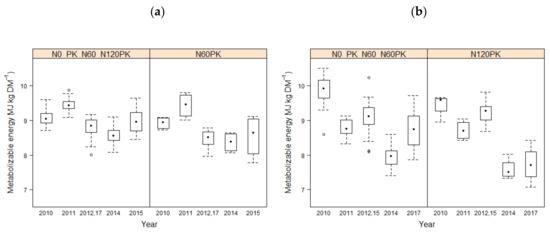 The minimal adequate model for the effect of fertilization treatment and time on the metabolizable energy (MJ kg DM−1) for the first (a) and second (b) cuts with different fertilization treatments between 2010 and 2017 (except 2013 and 2016). Level needed for female sheep (70–100 kg): 8.7–8.8 MJ kg DM−1, for ewes (70–100 kg) rearing a single lamb: 10.4–10.7 MJ kg DM−1, for rams 100–120 kg: 9.4 MJ kg DM−1, for rams in the breeding season: 10.0 MJ kg DM−1 [76].