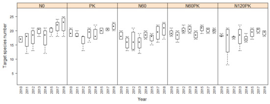 Development of the number of target species with different fertilization treatments between 2010 and 2018 (except 2016). There were no significant differences between treatments or years according to the generalized linear model (GLM).