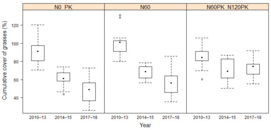 Effects of fertilizer and year on the cumulative cover of grasses according to the minimal adequate model. The model had three levels for the fertilizer and three levels for year (Figure 5).