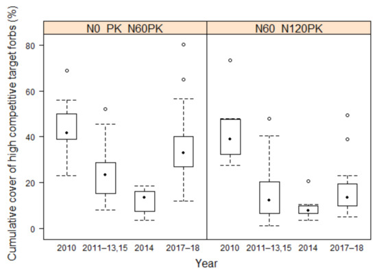 Effects of fertilizer and year on the cumulative cover of high-competitive target forbs according to the minimal adequate model. The model had two levels for the fertilizer and four levels for year (Figure 7).