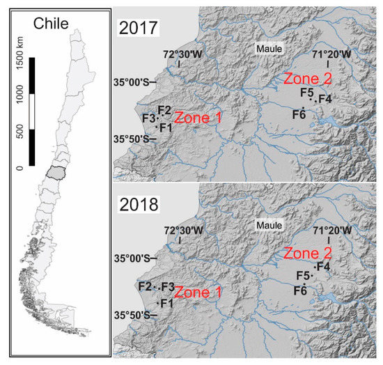 Location of the sampled zones for 2017 and 2018. F1–F3 are the fields collected in Zone 1, and F4–F6 are fields collected in Zone 2 (Table S1).