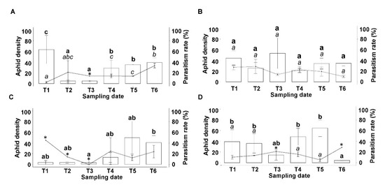 Aphid density (Mean ± Standard error bars) and parasitism rate (Mean ± Standard error, lines) per 100 wheat tillers in three fields sampled during the sampling dates (All fields were sampled on the same day and repeated every two weeks to complete six sampling dates T1–T6) in (A) Zone 1 and (B) Zone 2 throughout 2017; and (C) Zone 1 and (D) Zone 2 throughout 2018. Different letters show significant differences at p < 0.05 (bold letters for aphid density and italic letters for parasitism rate). * Data were obtained from one field, and hence multiple comparisons were impossible to calculate.