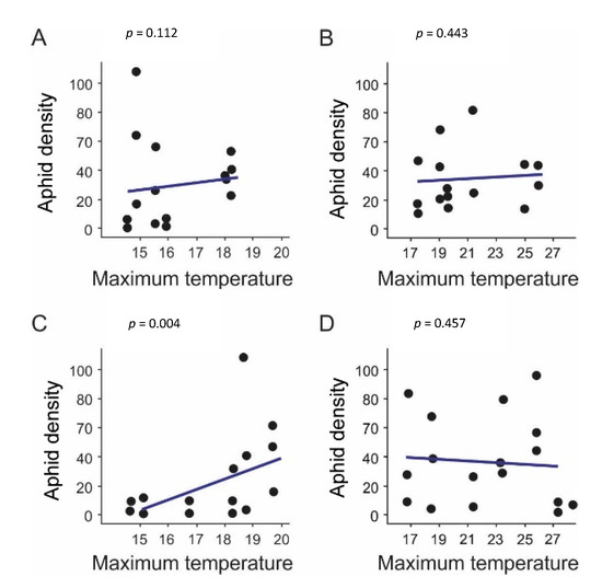 Effect of maximum temperature on aphid density (number of S. avenae per 100 wheat tillers). (A) Zone 1 and (B) Zone 2 throughout 2017; and (C) Zone 1 and (D) Zone 2 throughout 2018. p indicates the p-value obtained from a generalized linear mixed model (GLMM).