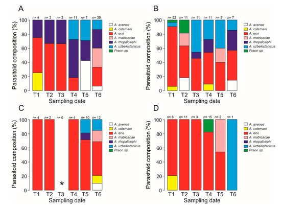 Parasitoid species composition according to the sampling date (T1–T6). (A) Zone 1 and (B) Zone 2 throughout 2017; and (C) Zone 1 and (D) Zone 2 throughout 2018. n= total number of individuals emerged. * No mummies were found.