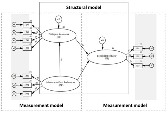 Analyzing the structural equation models (SEM), it can be observed that (H1) a significant and clear correlation (0.508, p < 0.001) of the ecological awareness (EA) which had a positive impact on the ecological behavior (EB). Analyzing the gathered data, it should be emphasized that there was a positive correlation (H3) (0.462, p < 0.05) between the influence on food preferences (IFP) and ecological awareness (EA).