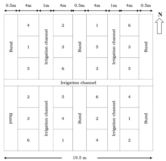 Layout of experimental plots in the field and treatment allocation channels. The numbers within the plots indicate the treatments: 1 indicates T1, control (no fertilizer or manure); 2 indicates T2, rice straw + NPK (nitrogen, phosphorus, potassium) as chemical fertilizer; 3 indicates T3, Gliricidia leaves + NPK as chemical fertilizer; 4 indicates T4, farmyard manure (FYM) + NPK as chemical fertilizer; 5 indicates T5, Vermicompost + NPK as chemical fertilizer; 6 indicates T6, only chemical fertilizers.