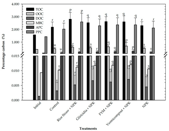 The effects of treatments on different carbon fractions (p < 0.05) were tested using analysis of variance (ANOVA) in SPSS software package (IBM Inc., Chicago, IL, USA). The mean effects were further subjected to a post-hoc test using Duncan’s multiple range test (DMRT).