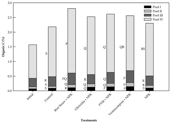 Effects of treatments on different pools of organic carbon extracted based on oxidizability (pool-I, pool-II, pool-III and pool-IV). The values are the averages over three crop growth stages through three consecutive crop growing seasons. Bars followed by the same letter are not significantly different at p < 0.05.