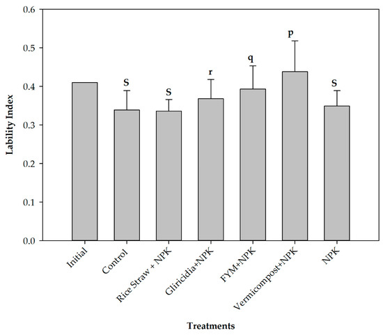 Effects of treatments on the lability index (LI). The values are the averages and error bars are the standard deviations of measurements over three crop growth stages through three consecutive crop growing seasons. Bars followed by the same letter are not significantly different at p < 0.05.