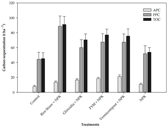 The amounts of CO2 sequestered in relation to the initial values of APC, PPC and TOC under each INM system were different (Figure 5). Carbon sequestration in terms of both TOC (91.11 t ha−1) and PPC (88.74 t ha−1) was highest in RS + NPK plots as compared to that of control. Plots that received chemical fertilizer only sequestered 19.02 and 16.84% CO2 in TOC and PPC pools, respectively, compared to control (no fertilizer) plots. The highest CO2 sequestration (21.01 t ha−1) rate in the APC pool was observed in VC + NPK plots, followed by FYM + NPK (18.23 t ha−1) and GL + NPK (16.47 t ha−1).