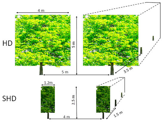 Top: Schematic representation of the two orchard systems studied: a high-density (HD) and a super high-density (SHD) system. Tree age and spacing and canopy height are representative of typical, mature, HD and SHD system, respectively. Bottom: pictures of the HD (a) and SHD (b) orchards.