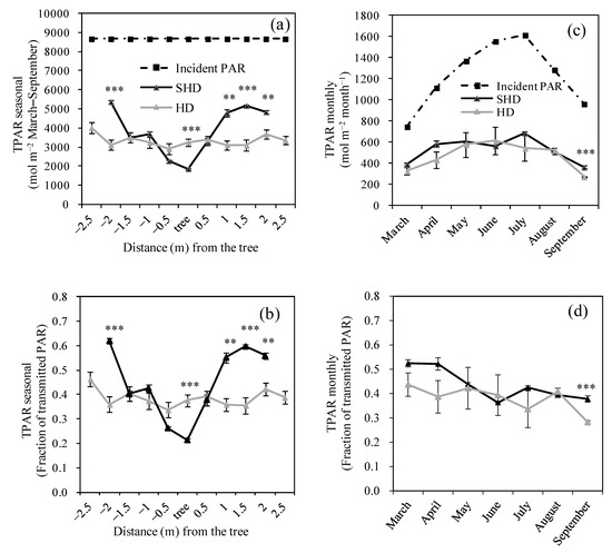 The two orchards showed a similar seasonal pattern of the overall transmitted PAR (i.e., integrated over the whole transect: TPARmonthly) (Figure 2c). This pattern was similar to that of the incident PAR, with increasing trends in spring, then decreasing from July to September, in accordance with model predictions [14]. However, when expressed as a fraction of the incident PAR, TPARmonthly decreased over the season (Figure 2d). This was due to the fact that trees were pruned before the beginning of the experiment and the canopies grew during the season, decreasing the fraction of PAR transmitted. The overall transmitted PAR (i.e., integrated over the whole transect and cumulated for the whole season), was significantly (p < 0.05) but slightly lower for the HD olive orchard (3293.4 ± 231.8 mol m−2/0.38 ± 0.03) than for the SHD (3701.7 ± 18.8 mol m−2/0.43 ± 0.002).