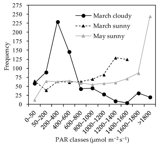 The class frequency distributions of the incident PAR values measured above the canopy differed substantially with season and between clear (sunny) and overcast (cloudy) days. To exemplify this, Figure 3 shows data from three sample days: two in March (one clear and one uniformly overcast) and one in May (clear). March was chosen as an example, because it was the month with the shortest (i.e., darkest) days in the dataset, and we also happen to have a clear day and a uniformly overcast day in the same month, so we could compare them. The clear day in May was chosen to compare a clear day in a period of long days (May) with a clear day in a period of short (dark) days (March). We chose May instead of June, when days are longest, because we happened to not have perfectly clear days in June, so May had the longest perfectly clear day in the dataset. On the overcast day, the most frequent incident PAR values were those of relatively low intensity (200–400 µmol m−2 s−1). The frequencies decreased for both lower and higher PAR classes. This pattern is explained by the fact that clouds prevent the passage of direct beam radiation with high intensities and the light environment is characterized mainly by low-intensity diffuse radiation. By contrast, on a clear day in the same month (i.e., March), the most frequent values were those in the highest classes of the PAR range available that day (1200–1400 and 1400–1600 µmol m−2 s−1), with a relatively uniform distribution of PAR values in lower classes. Compared to the overcast day, the clear day had higher frequencies of PAR values in the classes above the 600–800 µmol m−2 s−1, and lower frequencies in the classes below. The clear day in May has a pattern similar to the clear day in March, but skewed towards higher classes because of the higher sun elevation.