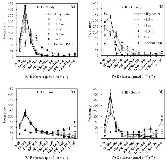 To better understand how the different systems (HD and SHD) influence the characteristics of the transmitted PAR, we compared the frequency distributions of the transmitted PAR values for the two systems (clear days) only for the extreme positions: alley centers (−2.5 m from tree row in the HD and −2 m in the SHD system, Figure 5a) and below the tree (Figure 5b).