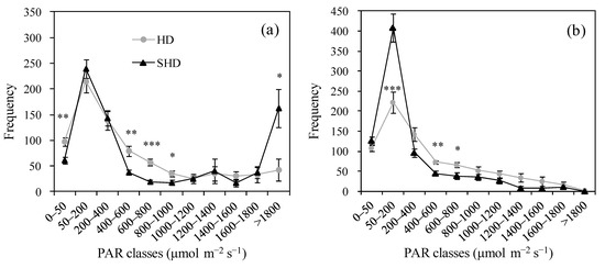Class frequency distribution (mean of all available data) of transmitted PAR values as measured every minute, from dawn to dusk, as in Figure 4, but only for clear days, and for two positions along the transect, i.e., (a) the alley center (the position with the highest TPARseasonal, 2.5 m from tree row in HD system and at 2 m in SHD, and (b) the position below the tree. Statistical significance between systems, within each position, was tested by analysis of variance (ANOVA, * = p < 0.05; ** = p < 0.01, *** = p < 0.001).