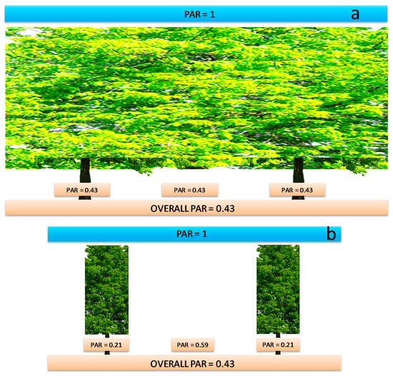This implies greater self-shading and lower PAR levels at the bottom of the canopy in SHD systems compared to systems with a more horizontally uniform canopy. This concept is illustrated in Figure 6 where a theoretical canopy with perfectly uniform horizontal canopy cover is illustrated in the top scheme. In this theoretical canopy, the PAR transmitted on the orchard floor is uniformly distributed in space and the overall PAR transmitted is assumed to be 0.43 (i.e., the same found for the SHD system in this experiment). In this situation, self-shading is uniform and bottom-canopy leaves are uniformly illuminated across the orchard; T = 0.43, Tf = 0, Tc = 0.43 and L’ is the minimum possible for that light transmittance level (see Equation (1)) implying the lowest possible level of self-shading. The lower scheme in Figure 6 shows instead the actual canopy of the SHD system in this experiment, with the values of PAR transmission under the trees (PAR = 0.21 under the tree row; PAR = 0.59 in the alley center) as found in this experiment. While the overall PAR transmittance (and therefore PAR interception), is the same in both schemes (overall transmitted PAR = 0.43), the irradiance below the tree row is less than half (i.e., 0.21 vs. 0.59). Using Equation 1, while T remains 0.43, Tf >> 0, thus Tc << 0.43, implying that L’ is much higher than for HD. This implies that bottom-canopy leaves are exposed to much lower PAR levels than in the top scheme, even though overall PAR transmission is the same. The much greater spatial uniformity of measured transmitted PAR values in the HD orchard in this study, compared to the SHD system (Figure 2a,b), suggests that the HD orchard here considered was close to the theoretical scenario (i.e., uniform interception) shown in the top scheme of Figure 6, resulting in lower self-shading than in the more heterogeneous canopy cover of the SHD system.