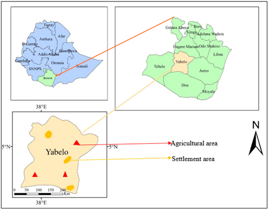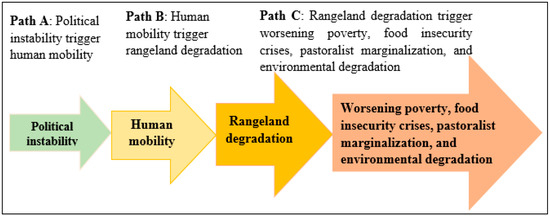 Political instability occurs at local, regional, and/or national levels between the government and other political elites [1,2]. These actions may result in changes in the pastoralist community’s subsistence patterns, disruption of traditional territorial governance arrangements, and reduced adaptive capacity of the sustainable practice of rangeland management [3]. Rangelands are natural grasslands used by domestic livestock or wild animals for grazing or browsing [4]. However, in many parts of the world, including Africa (mainly Ethiopia), the current rapid degradation of rangelands is caused by both natural and human-induced factors [5]. In Ethiopia, about 20%, 24%, and 51% of the rangelands are in good, degraded, and highly degraded status, respectively, indicating a decrease in the productivity and carrying capacity potential of rangeland [5,6,7]. In the rangeland area, pastoral livelihoods are mainly characterized by socio-ecological stress, risk, and uncertainties due to changing socio-political, economic, and natural environment conditions [8,9].