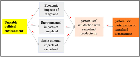 The government has regularly tried to monitor these pastoral areas via inter-governmental authorities to avoid conflicts within pastoral communities [33]. The “enabling political environment for rangeland management” indicator shows that rangeland sites used for grazing are more likely used to develop, implement, and follow-up management plans in areas with more stable political conditions. Conversely, lack of planning, implementation practice, and follow-up are more likely in areas with unstable political environments [34]. The term PI overlaps with governance [35]; however, in this case, PI does not refer to political parties or systems, rather it indicates the situation and practice within pastoral communities, in which leadership, structure, mechanisms, and strategies or policies are critical to the exercise and implementation of sustainable rangeland management [36,37]. In the study area, political instability is mainly due to internal conflict, youth unemployment, land ownership, military involvement in politics, religious tensions, ethnic tensions, lack of democratic accountability, corruption, inequalities, ethnic political parties, misrepresentation of historical events, and the policy of ethnic-based federalism, which has escalated old inter-ethnic resource conflicts [38,39]. This has complicated access to grazing sites in the Borana rangelands, decreased the usual practice of rangeland management, and increased the vulnerability of Borana pastoralists to both anthropogenic and natural factors that accelerate rangeland degradation. Pastoralists’ perceptions of the impacts of PI on sustainable practices and productivity of rangeland management vary [40]. Thus, we assessed economic, environmental, and socio-cultural aspects using the structural model shown in Figure 2. Therefore, in our proposed model, we incorporated observations to test our hypotheses regarding the impact of PI, and pastoralists’ perceptions of its effect, on rangeland management practice.