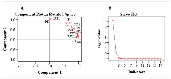 Indicator’s linkage in principal components in a two-dimensional specie (A) and scree plot; eigenvalues plotted in descending order (B).