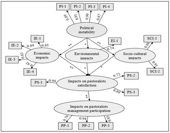 The model of political instability effects on sustainable rangeland management. ** Statistically significant at p < 0.001, * statistically significant at p < 0.05 (the model was modified from [30]).