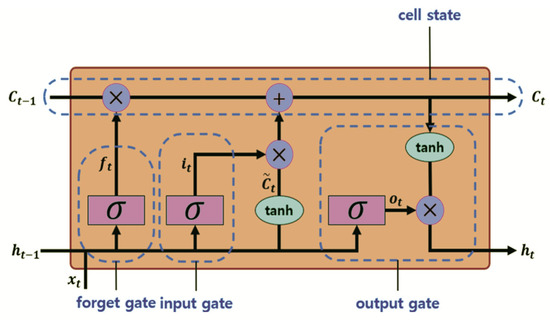 Long short-term memory (LSTM) is a type of recurrent neural network (RNN). It is proposed by Hochreiter and Schmidhuber [38] to solve long-term dependency and gradient vanishing problems. An LSTM cell usually consists of an input gate, an output gate, a forget gate and a cell state. The structure of a LSTM cell is shown below (Figure 1):