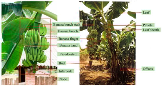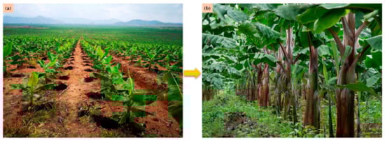 The banana plant is a large-scale perennial herbaceous fruit tree. After banana seedlings are managed in the nursery for 7 months and grow to more than 1 m in height, they can be dug out and planted in a new banana orchard [22,23]. For planting, local varieties that are suitable for planting should be chosen, having strong stress resistance, high yield and quality, and being best-sellers in the market. According to the regulations of “Banana cultivated seedlings” (NY/T 357-2007), when seedlings are used for planting, the number of plants per hectare should not exceed 2250. Planting density can be adjusted according to the characteristics of the variety, local climate, and topography [24,25]. The banana plant and its growth status after planting are shown in Figure 1. Although bananas are perennials, each banana plant can only bloom and bear fruit once in its lifetime. The best harvest period for bananas is the 12th to 13th month after planting. The mother plant, after fruiting, will gradually wither and need to be cut off, in time, and then the offsets, drawn from the underground bulb, will replace the mother plant and continue to grow, bloom, and bear fruit [26]. The height of banana plants varies with the variety and planting environment, generally ranging from 2 to 7 m.