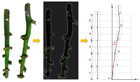 The curvature of the bunch stalk mainly depends on the variety of the banana plants and the cultivation environment, as well as the difference in the management of banana orchards by farmers [30]. In the experiments of measuring the curvature of bunch stalks, we divided them into 5 segments. During the measurement, we put bunch stalks on an experimental bench covered with graph paper and took pictures from the top view of the bench. A digital color camera (Canon sx610hs) with a resolution of 2048 × 1536 pixels was used. The camera exposure mode was set to auto exposure; the shooting distance was 100 cm. In Photoshop software, background removal and contour extraction of the taken pictures were carried out. We set the origin of the coordinate system at one end of the bunch stalk and set a marker every 150 mm along the positive direction of the Y-axis, which was marked as A, B, C, D, and E, respectively. We used the angle α between the line of each marker to the origin and the positive direction of the Y-axis to represent the curvature of each segment of the bunch stalk, as shown in Figure 3. Samples of the same variety and segment were measured three times, and the average value of the results was taken. The curvature of the bunch stalk (α) can be obtained as follows in Equation (3):